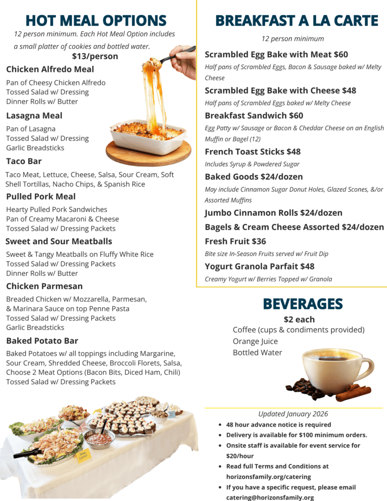 Receive professionally prepared, catered meals delivered to your business or any location for meetings, events, staff appreciation, or group lunches. 100% of profits from each catered meal goes back to the Meals on Wheels program to offset gaps in funding and provide more meals for seniors in our community.